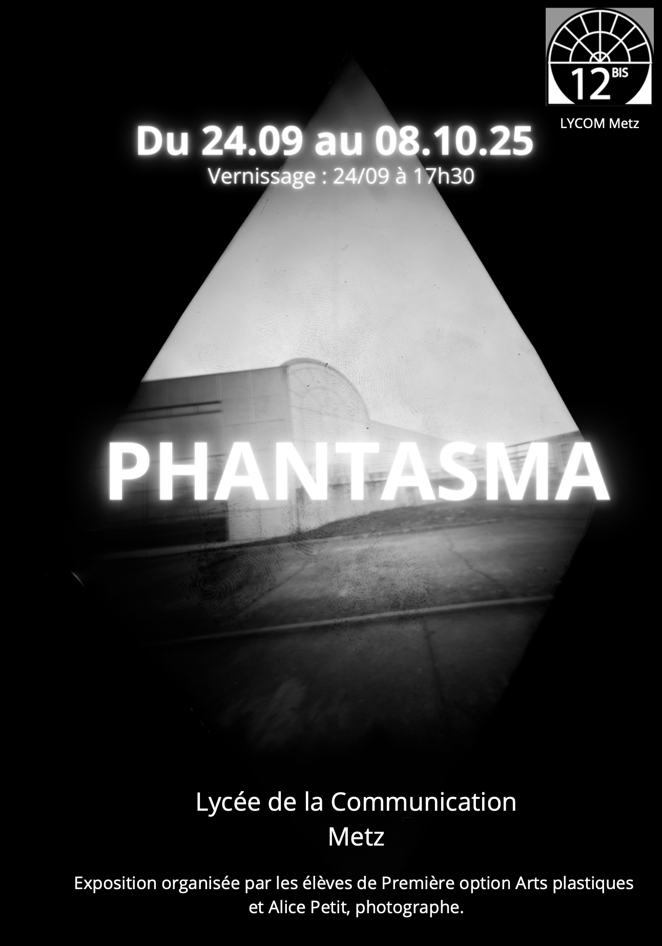 L’exposition Phantasma (fantôme, simulacre, trompe-l’oeil), créée par les élèves de Première, option Arts plastiques, présente une sélection de photographies réalisées lors d’un atelier sténopé conduit par la photographe Alice Petit.